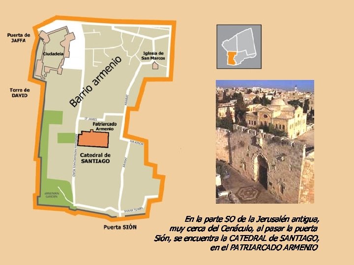 En la parte SO de la Jerusalén antigua, muy cerca del Cenáculo, al pasar la puerta Sión, se encuentra la CATEDRAL de SANTIAGO, en el PATRIARCADO ARMENIO