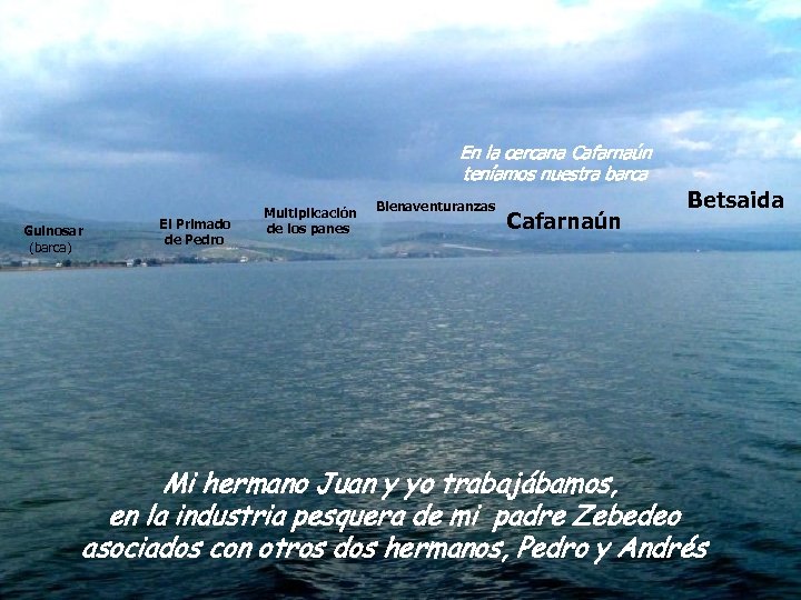 Soy judío de Galilea En la cercana Cafarnaún Nací teníamos la orilla en nuestra barca Guinosar (barca) El Primado de Pedro norte del Bienaventuranzas LAGO Cafarnaún Lago de GALILEA Multiplicación de los panes … nací en esta pequeña Betsaida población Mi hermano Juan y yo trabajábamos, en la industria pesquera de mi padre Zebedeo asociados con otros dos hermanos, Pedro y Andrés
