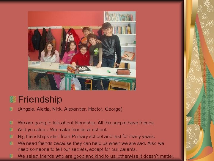 Friendship (Angela, Alexia, Nick, Alexander, Hector, George) We are going to talk about friendship. All the people have friends. And you also…We make friends at school. Big friendships start from Primary school and last for many years. We need friends because they can help us when we are sad. Also we need someone to tell our secrets, except for our parents. We select friends who are good and kind to us, otherwise it doesn’t matter.