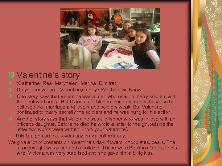 Valentine’s story (Catherine- Rea- Maryhelen- Marina- Dimitra) Do you know about Valentine; s story? We think we Know. One story says that Valentine was a man who used to marry soldiers with their beloved ones. But Claudius forbidden these marriages because he believed that marriage and love made soldiers weak. But Valentine continued to marry secretly the soldiers and he was hung for his action. Another story says that Valentine was a prisoner who was in love with an officer; s daughter. Before he died he wrote a letter to the girl. outside the letter two words were written ‘From your Valentine’. This is a phrase that lovers say on Valentine’s day. We give a lot of presents on Valentine’s day: flowers, chocolates, bears. The strangest gift was a car and a building. These were Beckham’s gifts to his wife. Victoria was very surprised and she gave him a biiiig kiss.