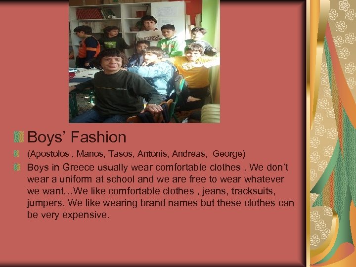 Boys’ Fashion (Apostolos , Manos, Tasos, Antonis, Andreas, George) Boys in Greece usually wear comfortable clothes. We don’t wear a uniform at school and we are free to wear whatever we want…We like comfortable clothes , jeans, tracksuits, jumpers. We like wearing brand names but these clothes can be very expensive.