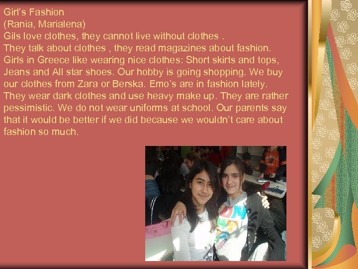 Girl’s Fashion (Rania, Marialena) Gils love clothes, they cannot live without clothes. They talk about clothes , they read magazines about fashion. Girls in Greece like wearing nice clothes: Short skirts and tops, Jeans and All star shoes. Our hobby is going shopping. We buy our clothes from Zara or Berska. Emo’s are in fashion lately. They wear dark clothes and use heavy make up. They are rather pessimistic. We do not wear uniforms at school. Our parents say that it would be better if we did because we wouldn’t care about fashion so much.