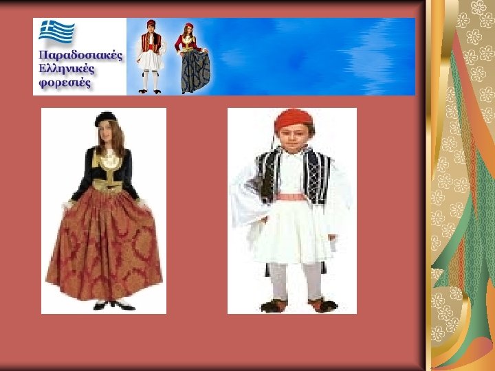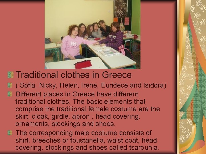 Traditional clothes in Greece ( Sofia, Nicky, Helen, Irene, Euridece and Isidora) Different places in Greece have different traditional clothes. The basic elements that comprise the traditional female costume are the skirt, cloak, girdle, apron , head covering, ornaments, stockings and shoes. The corresponding male costume consists of shirt, breeches or foustanella, waist coat, head covering, stockings and shoes called tsarouhia.
