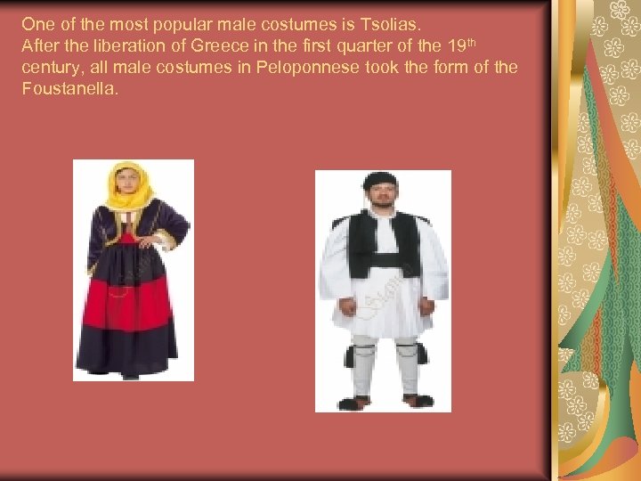 One of the most popular male costumes is Tsolias. After the liberation of Greece in the first quarter of the 19 th century, all male costumes in Peloponnese took the form of the Foustanella.