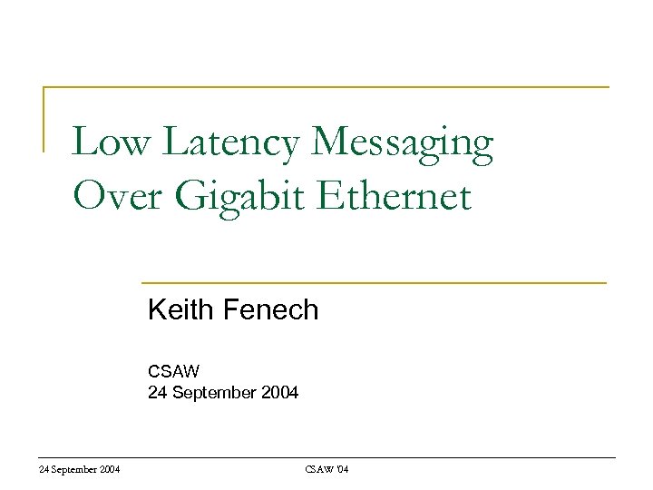 Low Latency Messaging Over Gigabit Ethernet Keith Fenech CSAW 24 September 2004 CSAW '04