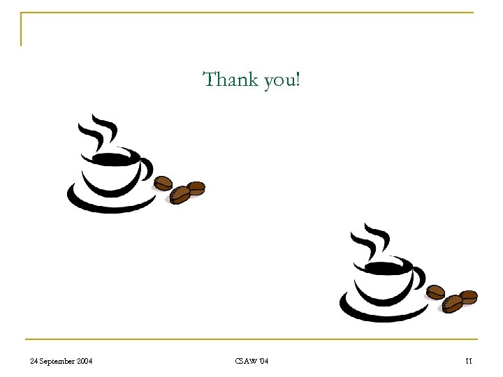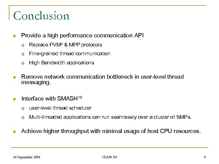 Conclusion n Provide a high performance communication API q Replace PVM 8 & MPI 9 protocols q Fine-grained thread communication q High Bandwidth applications n Remove network communication bottleneck in user-level thread messaging. n Interface with SMASH 10 q q n user-level thread scheduler Multi-threaded applications can run seamlessly over a cluster of SMPs. Achieve higher throughput with minimal usage of host CPU resources. 24 September 2004 CSAW '04 9