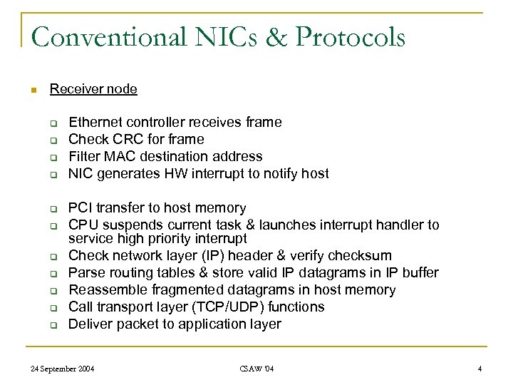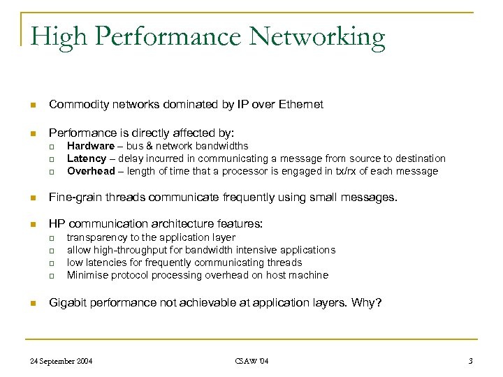 High Performance Networking n Commodity networks dominated by IP over Ethernet n Performance is directly affected by: q q q Hardware – bus & network bandwidths Latency – delay incurred in communicating a message from source to destination Overhead – length of time that a processor is engaged in tx/rx of each message n Fine-grain threads communicate frequently using small messages. n HP communication architecture features: q q n transparency to the application layer allow high-throughput for bandwidth intensive applications low latencies for frequently communicating threads Minimise protocol processing overhead on host machine Gigabit performance not achievable at application layers. Why? 24 September 2004 CSAW '04 3