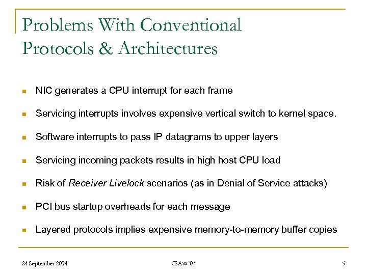 Conventional NICs & Protocols n Receiver node q q q Ethernet controller receives frame Check CRC for frame Filter MAC destination address NIC generates HW interrupt to notify host PCI transfer to host memory CPU suspends current task & launches interrupt handler to service high priority interrupt Check network layer (IP) header & verify checksum Parse routing tables & store valid IP datagrams in IP buffer Reassemble fragmented datagrams in host memory Call transport layer (TCP/UDP) functions Deliver packet to application layer 24 September 2004 CSAW '04 4