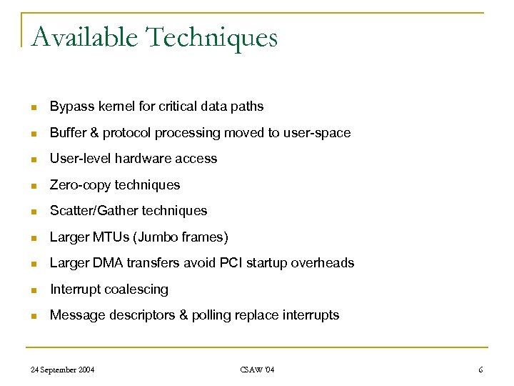 Available Techniques n Bypass kernel for critical data paths n Buffer & protocol processing moved to user-space n User-level hardware access n Zero-copy techniques n Scatter/Gather techniques n Larger MTUs (Jumbo frames) n Larger DMA transfers avoid PCI startup overheads n Interrupt coalescing n Message descriptors & polling replace interrupts 24 September 2004 CSAW '04 6