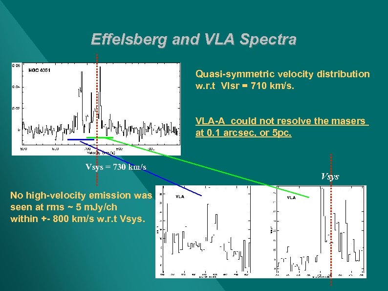 Effelsberg and VLA Spectra Quasi-symmetric velocity distribution w. r. t Vlsr = 710 km/s. VLA-A could not resolve the masers at 0. 1 arcsec, or 5 pc. Vsys = 730 km/s No high-velocity emission was seen at rms ~ 5 m. Jy/ch within +- 800 km/s w. r. t Vsys