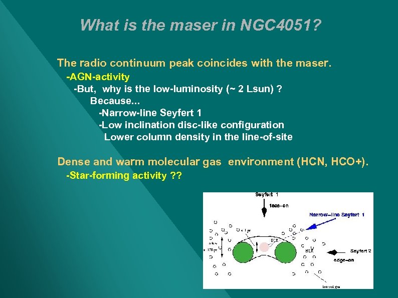 What is the maser in NGC 4051? The radio continuum peak coincides with the maser. -AGN-activity -But, why is the low-luminosity (~ 2 Lsun) ? Because. . . -Narrow-line Seyfert 1 -Low inclination disc-like configuration Lower column density in the line-of-site Dense and warm molecular gas environment (HCN, HCO+). -Star-forming activity ? ?
