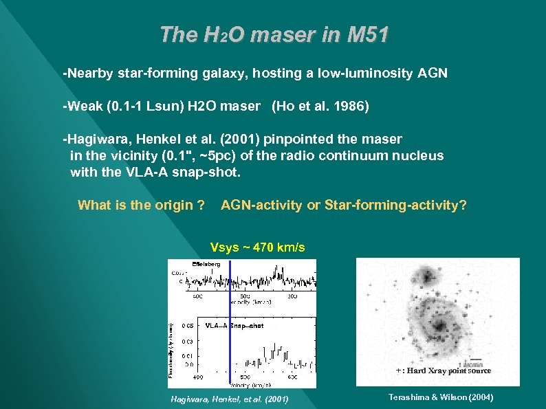 The H 2 O maser in M 51 -Nearby star-forming galaxy, hosting a low-luminosity AGN -Weak (0. 1 -1 Lsun) H 2 O maser (Ho et al. 1986) -Hagiwara, Henkel et al. (2001) pinpointed the maser in the vicinity (0. 1", ~5 pc) of the radio continuum nucleus with the VLA-A snap-shot. What is the origin ? AGN-activity or Star-forming-activity? Vsys ~ 470 km/s + : Hard Xray point source Hagiwara, Henkel, et al. (2001) Terashima & Wilson (2004)