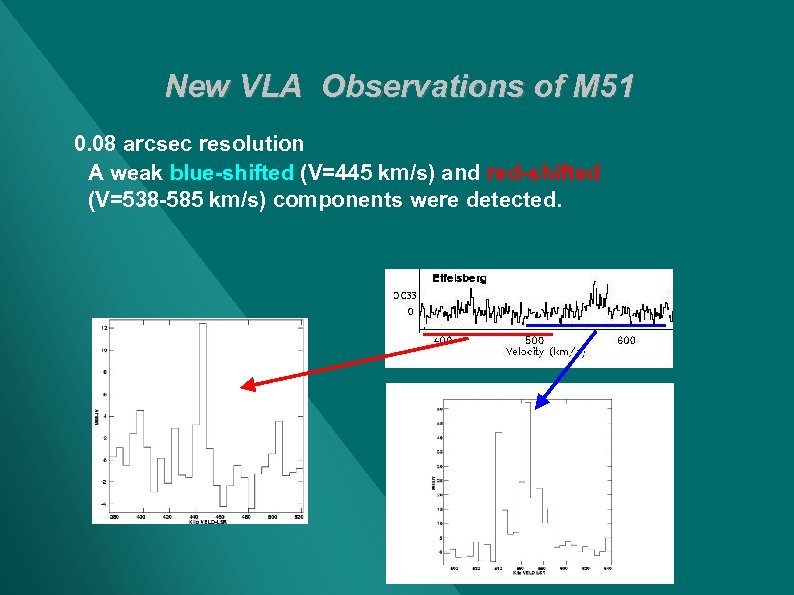 New VLA Observations of M 51 0. 08 arcsec resolution A weak blue-shifted (V=445 km/s) and red-shifted (V=538 -585 km/s) components were detected.