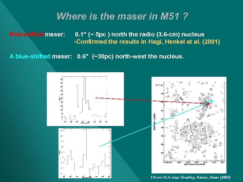 Where is the maser in M 51 ? Red-shifted maser: 0. 1" (~ 5 pc ) north the radio (3. 6 -cm) nucleus -Confirmed the results in Hagi, Henkel et al. (2001) A blue-shifted maser: 0. 6" (~30 pc) north-west the nucleus. 3. 6 -cm VLA map: Bradley, Kaiser, Baan (2004)