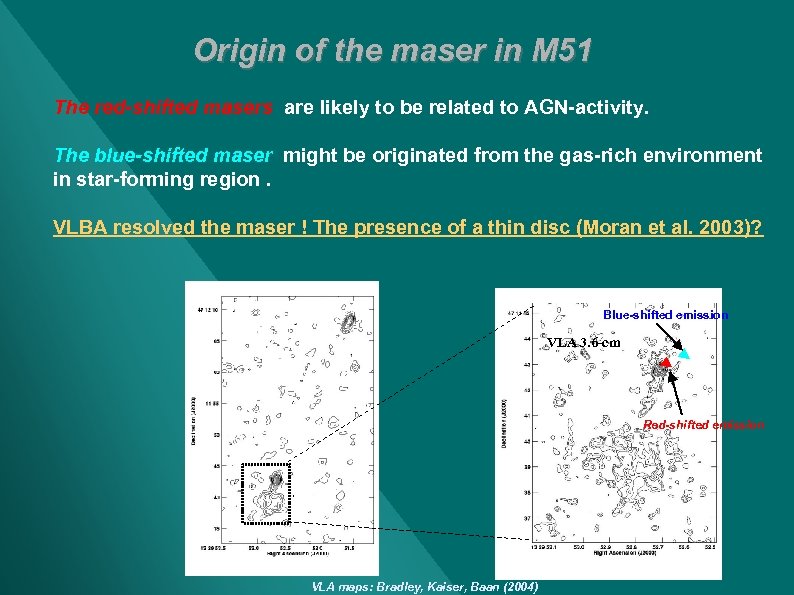 Origin of the maser in M 51 The red-shifted masers are likely to be related to AGN-activity. The blue-shifted maser might be originated from the gas-rich environment in star-forming region. VLBA resolved the maser ! The presence of a thin disc (Moran et al. 2003)? Blue-shifted emission VLA 3. 6 -cm Red-shifted emission VLA maps: Bradley, Kaiser, Baan (2004)