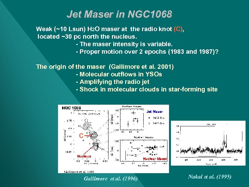 Jet Maser in NGC 1068 Weak (~10 Lsun) H 2 O maser at the radio knot (C), located ~30 pc north the nucleus. - The maser intensity is variable. - Proper motion over 2 epochs (1983 and 1987)? The origin of the maser (Gallimore et al. 2001) - Molecular outflows in YSOs - Amplifying the radio jet - Shock in molecular clouds in star-forming site C Gallimore et al. (1996) Nakai et al. (1995)