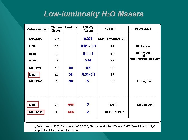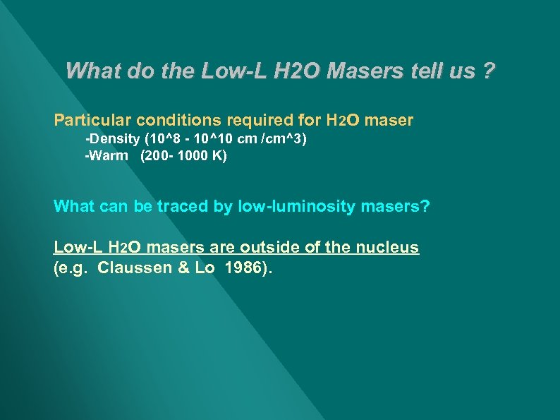 What do the Low-L H 2 O Masers tell us ? Particular conditions required for H 2 O maser -Density (10^8 - 10^10 cm /cm^3) -Warm (200 - 1000 K) What can be traced by low-luminosity masers? Low-L H 2 O masers are outside of the nucleus (e. g. Claussen & Lo 1986).