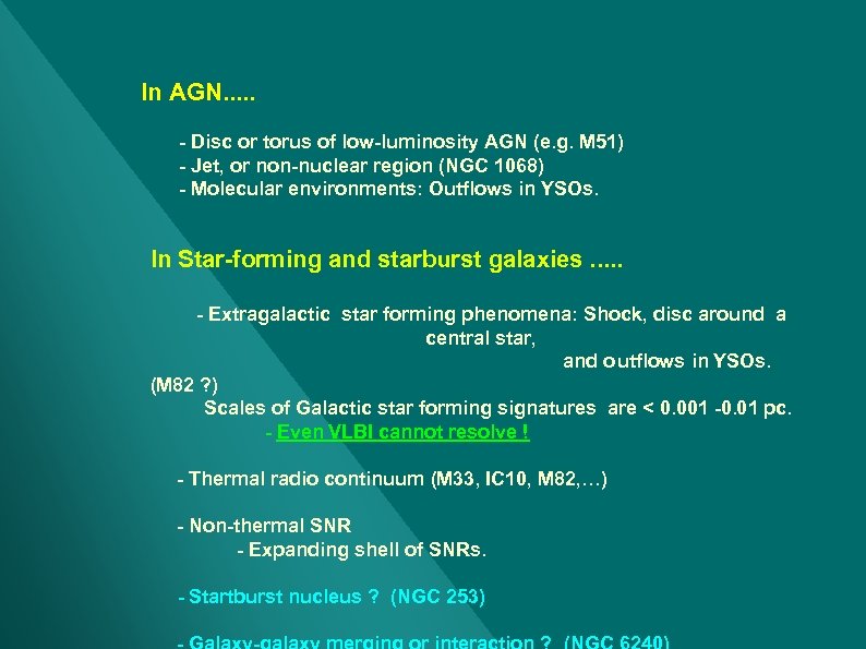In AGN. . . - Disc or torus of low-luminosity AGN (e. g. M 51) - Jet, or non-nuclear region (NGC 1068) - Molecular environments: Outflows in YSOs. In Star-forming and starburst galaxies. . . - Extragalactic star forming phenomena: Shock, disc around a central star, and outflows in YSOs. (M 82 ? ) Scales of Galactic star forming signatures are < 0. 001 -0. 01 pc. - Even VLBI cannot resolve ! - Thermal radio continuum (M 33, IC 10, M 82, …) - Non-thermal SNR - Expanding shell of SNRs. - Startburst nucleus ? (NGC 253)