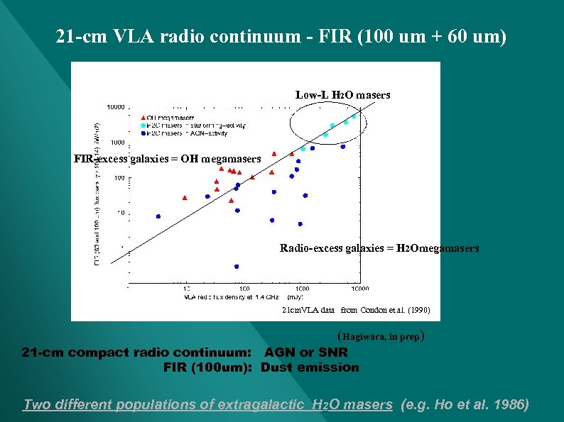 21 -cm VLA radio continuum - FIR (100 um + 60 um) Low-L H 2 O masers FIR-excess galaxies = OH megamasers Radio-excess galaxies = H 2 Omegamasers 21 cm. VLA data from Condon et al. (1990) (Hagiwara, in prep) 21 -cm compact radio continuum: AGN or SNR FIR (100 um): Dust emission Two different populations of extragalactic H 2 O masers (e. g. Ho et al. 1986)