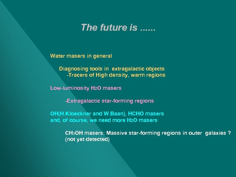 The future is. . . Water masers in general Diagnosing tools in extragalactic objects -Tracers of High density, warm regions Low-luminosity H 2 O masers -Extragalactic star-forming regions OH(H. Kloeckner and W. Baan), HCHO masers and, of course, we need more H 2 O masers CH 3 OH masers: Massive star-forming regions in outer galaxies ? (not yet detected)