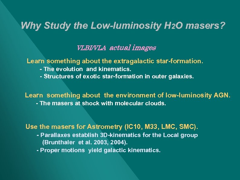 Why Study the Low-luminosity H 2 O masers? VLBI/VLA actual images Learn something about the extragalactic star-formation. - The evolution and kinematics. - Structures of exotic star-formation in outer galaxies. Learn something about the environment of low-luminosity AGN. - The masers at shock with molecular clouds. Use the masers for Astrometry (IC 10, M 33, LMC, SMC). - Parallaxes establish 3 D-kinematics for the Local group (Brunthaler et al. 2003, 2004). - Proper motions yield galactic kinematics.