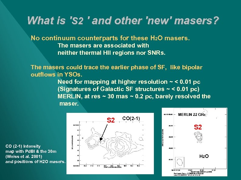 What is 'S 2 ' and other 'new' masers? No continuum counterparts for these H 2 O masers. The masers are associated with neithermal HII regions nor SNRs. The masers could trace the earlier phase of SF, like bipolar outflows in YSOs. Need for mapping at higher resolution ~ < 0. 01 pc (Signatures of Galactic SF structures ~ < 0. 01 pc) MERLIN, at res ~ 30 mas ~ 0. 2 pc, barely resolved the maser. S 2 CO (2 -1) Intensity map with Pd. BI & the 30 m (Weiss et al. 2001) and positions of H 2 O masers. CO(2 -1) MERLIN 22 GHz S 2 H 2 O
