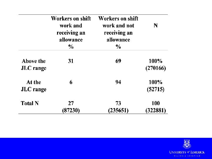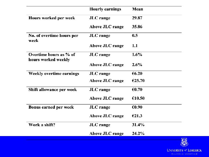 Results summary • Low levels of Sunday premiums, shift allowance and over-time payments • Workers who work no overtime and receive no shift allowance or bonuses more likely to be covered by JLC rates • Relatively high proportion of low paid workers; lower benefits • Collective agreement coverage important