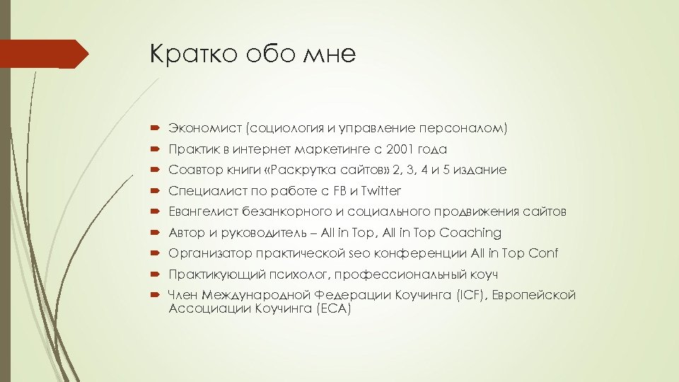Кратко обо мне Экономист (социология и управление персоналом) Практик в интернет маркетинге с 2001 года Соавтор книги «Раскрутка сайтов» 2, 3, 4 и 5 издание Специалист по работе с FB и Twitter Евангелист безанкорного и социального продвижения сайтов Автор и руководитель – All in Top, All in Top Coaching Организатор практической seo конференции All in Top Conf Практикующий психолог, профессиональный коуч Член Международной Федерации Коучинга (ICF), Европейской Ассоциации Коучинга (ECA)
