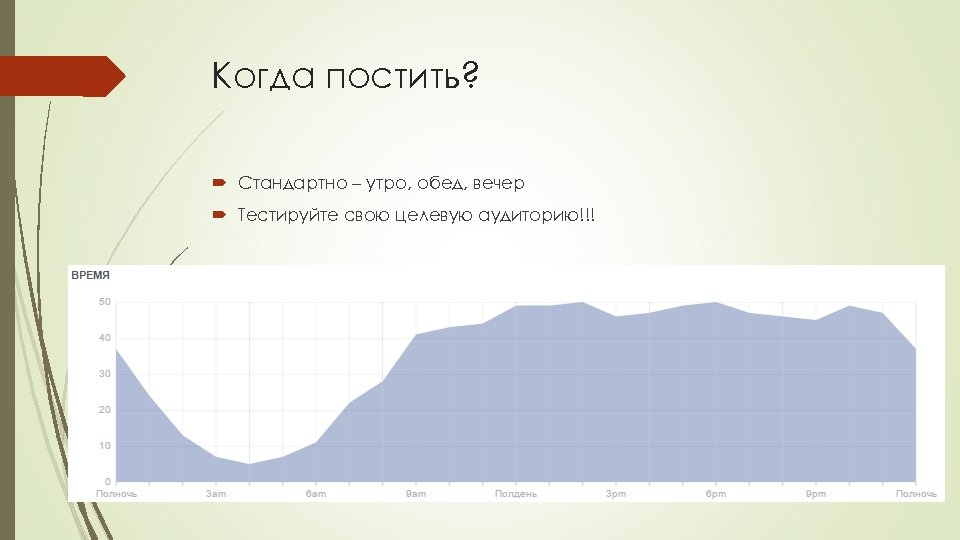 Когда постить? Стандартно – утро, обед, вечер Тестируйте свою целевую аудиторию!!!