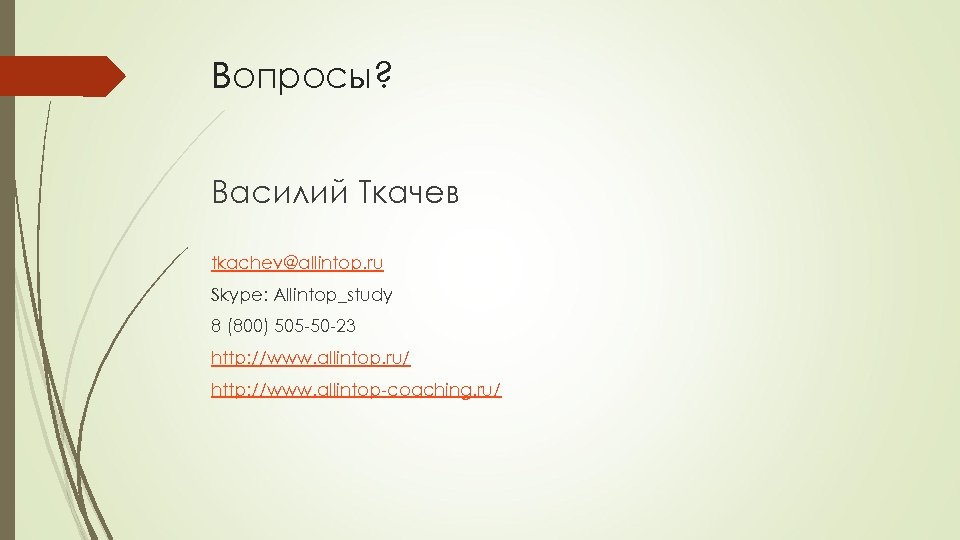 Вопросы? Василий Ткачев tkachev@allintop. ru Skype: Allintop_study 8 (800) 505 -50 -23 http: //www. allintop. ru/ http: //www. allintop-coaching. ru/