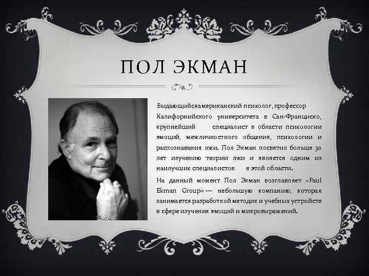 ПОЛ ЭКМАН Выдающийся американский психолог, профессор Калифорнийского университета в Сан-Франциско, крупнейший специалист в области психологии эмоций, межличностного общения, психологии и распознавания лжи. Пол Экман посвятил больше 30 лет изучению теории лжи и является одним из наилучших специалистов в этой области. На данный момент Пол Экман возглавляет «Paul Ekman Group» — небольшую компанию, которая занимается разработкой методик и учебных устройств в сфере изучения эмоций и микровыражений.
