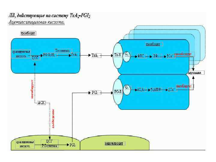 КЛАССИФИКАЦИЯ ЛС ДЛЯ ПРОФИЛАКТИКИ И ЛЕЧЕНИЯ ТРОМБОЗОВ I. Антиагреганты - СРЕДСТВА, СНИЖАЮЩИЕ АДГЕЗИЮ И АГРЕГАЦИЮ ТРОМБОЦИТОВ (Эндогенные - гепарин, ПЦ, ПГ D 2, F 2 , E 2 ) 1. Ингибиторы синтеза тромбоксана А 2 а. Ингибиторы ЦОГ-1 - Ацетилсалициловая кислота* (в дозе 75 -325 мг/сутки, 1 р/день), ацетилсалицилат лизина, трифлюзал (избират. блок ЦОГ-1 ТЦ) б. Ингибиторы ЦОГ-1 и Тр. А 2 -синтетазы - индобуфен, дазоксибен (блокатор тромбоксансинтет. ), ридогрел ( блокатор тромбоксансинтет. + рецепторов ТР-А 2 ).