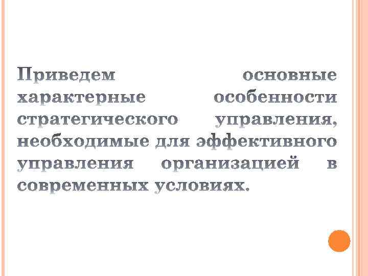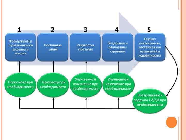 – обеспечение стратегической конкурентоспособности организации в условиях неопределенной внешней среды 1. Формирование стратегического видения и миссии организации; 2. Определения корпоративных целей и целей функциональных; 3. Разработка стратегий (корпоративных и функциональных) для достижения определенных выше целей; 4. Внедрение и реализация стратегии; 5. Оценка реализации стратегии изучения новых тенденций и осуществление корректирующих действий.