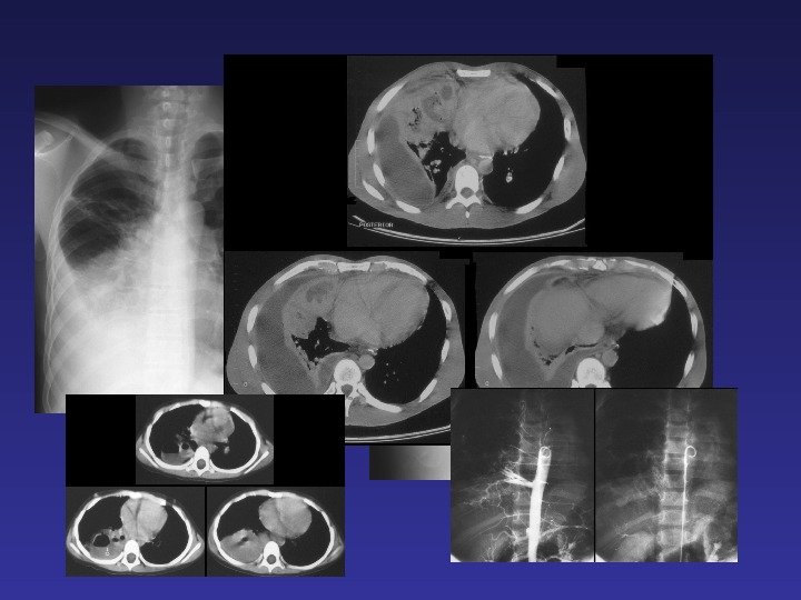 ОСТРЫЙ АБСЦЕСС ЛЕГКОГО Рентгенологические признаки: • полость с горизонтальным уровнем; • стенки абсцесса имеют неравномерную толщину; • внутренний контур полости обычно ровный и четкий; • наружные контуры нечеткие, размытые; • в окружающей легочной паренхиме – воспалительная инфильтрация. Дифференциальный диагноз: Распадающийся периферический рак, каверна, эхинококковая киста.