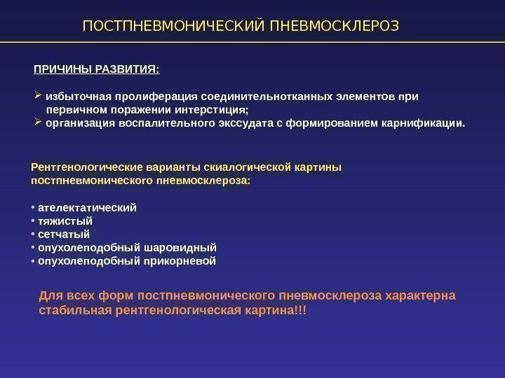 ПОСТПНЕВМОНИЧЕСКИЙ ПНЕВМОСКЛЕРОЗ ПРИЧИНЫ РАЗВИТИЯ: избыточная пролиферация соединительнотканных элементов при первичном поражении интерстиция; организация воспалительного экссудата с формированием карнификации. Рентгенологические варианты скиалогической картины постпневмонического пневмосклероза: • ателектатический • тяжистый • сетчатый • опухолеподобный шаровидный • опухолеподобный прикорневой Для всех форм постпневмонического пневмосклероза характерна стабильная рентгенологическая картина!!!