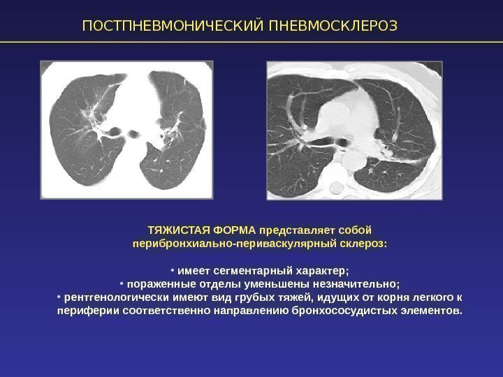 ПОСТПНЕВМОНИЧЕСКИЙ ПНЕВМОСКЛЕРОЗ ТЯЖИСТАЯ ФОРМА представляет собой перибронхиально-периваскулярный склероз: • имеет сегментарный характер; • пораженные отделы уменьшены незначительно; • рентгенологически имеют вид грубых тяжей, идущих от корня легкого к периферии соответственно направлению бронхососудистых элементов.