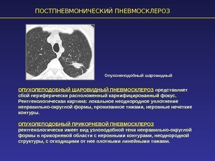 ПОСТПНЕВМОНИЧЕСКИЙ ПНЕВМОСКЛЕРОЗ Опухолеподобный шаровидный ОПУХОЛЕПОДОБНЫЙ ШАРОВИДНЫЙ ПНЕВМОСКЛЕРОЗ представляет сбой периферически расположенный карнифицированный фокус. Рентгенологическая картина: локальное неоднородное уплотнение неправильно-округлой формы, пронизанное тяжами, неровные нечеткие контуры. ОПУХОЛЕПОДОБНЫЙ ПРИКОРНЕВОЙ ПНЕВМОСКЛЕРОЗ рентгенологически имеет вид узлоподобной тени неправильно-округлой формы в прикорневой области с неровными контурами, неоднородной структуры, с отходящими от нее плотными линейными тяжами.
