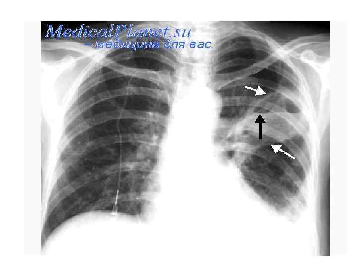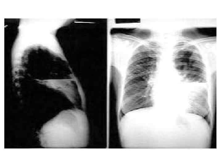 Рентгенография легких • в 2 х проекциях позволяет выявить обширное затемнение (полость распада неоднородной плотности) в пределах доли с тенденцией распространения на соседние доли или все легкое.
