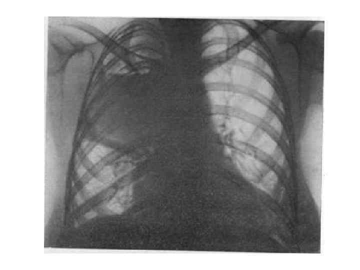 Рентгенография Характерно: участки ателектаза, пневмосклероза, усилеия брохолегочного рисунка в результате перибронхиального склероза и скопления в бронхах секрета, n “трамвайные рейки” – “парные полоски” утолщенных стенок бронхов. n Пораженный сегмент (доля) уменьшен в размерах, бронхи сосудов в участке поражения сближены. Возможно смещение средостения в сторону поражения, высокое стояние диафрагмы.