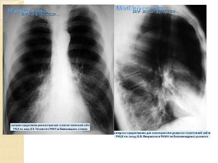 РЕНТГЕНОЛОГИЧЕСКИЙ СНИМОК ПРИ ПНЕВМОНИИ Рентгенограмма легких в прямой проекции. Участок просветления в средней и нижней доле правого легкого Рентгенограмма легких в боковой проекции. Участок просветления в нижней доле правого легкого