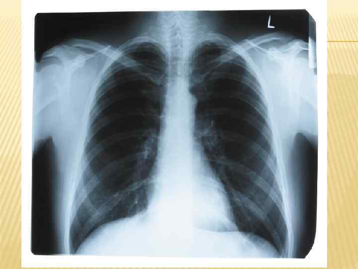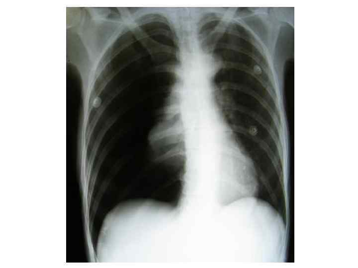 РЕНТГЕН И ПРИЗНАКИ ПНЕВМОНИИ ● Картина пневмонии характеризуется наличием на рентгенограмме определённых признаков. ● просветления лёгочной ткани различной формы, маленьких округлых, которые могут сливаться друг с другом (рентген признаки очаговой и очагово-сливной пневмонии), до больших участков, которые могут захватывать часть доли легкого, долю, всё легкое или оба лёгких (рентген признаки крупозной, долевой, субтотальной и тотальной пневмонии соответственно).