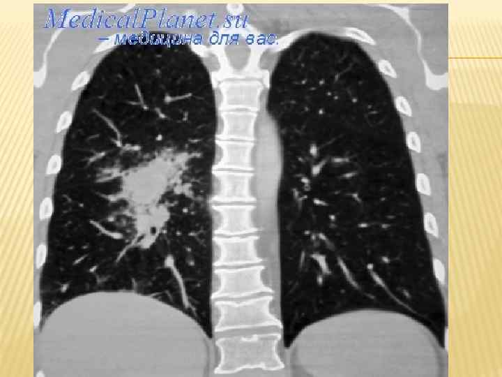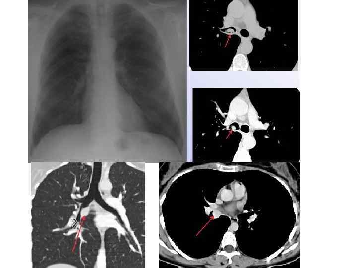 Рентгенологическая и КТ картина центрального рака легкого • • Узел в прикорневой зоне Коническое сужение или культя бронха Нарушение бронхиальной проходимости Увеличение внутригрудных лимфатических узлов