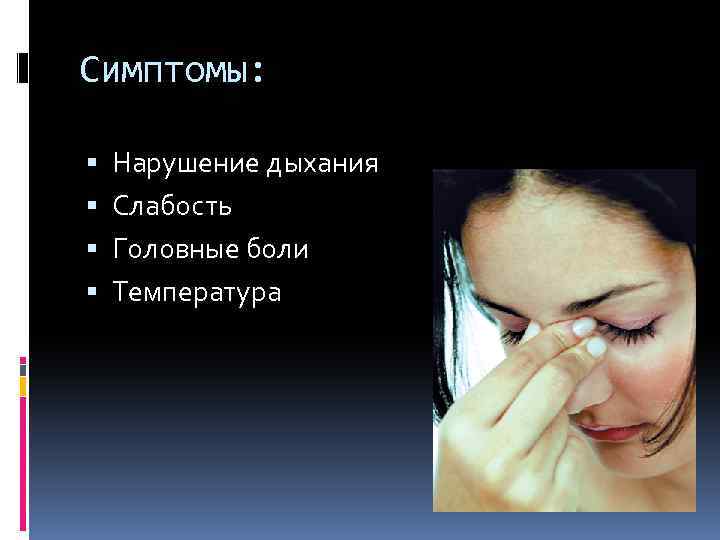 Симптомы: Нарушение дыхания Слабость Головные боли Температура