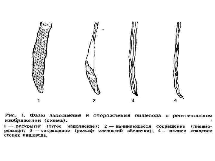 Исследование пищевода • Фаза тугого наполнения: ширина просвета – 2 3 см; скорости пассажа – 2 4 с. ; эластичности стенок; состоянии кардии • Фаза рельефа + характер контуров слизистой исследуются либо последовательным прохождением проглоченного воздуха, либо приемом 1 2 ложек густой взвеси бария. Определяются 3 4 продольные складки • Для дифференциации генеза сужений применяются холинолитики
