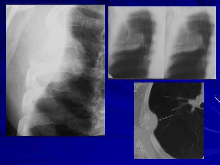 Одиночная (узловая) мезотелиома образование полуовальной, полуокруглой, широким основанием прилежащее к париетальной плевре, внутренним выпуклым контуром направленное в сторону легкого. Внутренний контур осумкования плавно переходит в прилежащую плевру и образует с ней тупые углы Плевра вблизи осумкования утолщена Синусы вблизи осумкования выполнены жидкостью или облитерированы