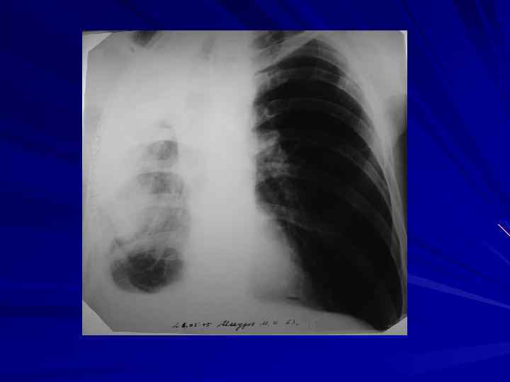 Дифференциальная диагностика Ограниченный пиопневмоторакс Вертикальный размер преобладает Над горизонтальным уровнем нет легочного рисунка Меняет форму и размеры при дыхании Бронхи огибают пиопневмоторакс Субплевральный абсцесс Горизонтальный преобладает Есть элементы легочного рисунка Не меняет Входят в полость