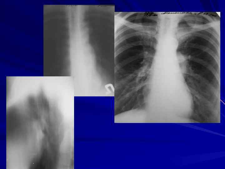 Р-признаки диффузной мезотелиомы Равномерное утолщение плевры на ограниченном участке Быстрое увеличение протяженности и появление одиночных или множественных узловых образований на фоне утолщения Раннее появление плеврита и быстрое его накопление Симптом неподвижного средостения Уменьшение в объеме пораженного легкого Появление подобных изменений в противоположной плевральной полости Увеличение ЛУ корня и средостения Очаговые образования в легком - метастазы