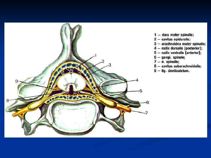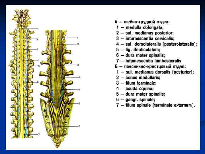Анатомия Спинной мозг начинается на уровне большого затылочного отверстия и заканчивается у взрослых мозговым конусом на уровне сочленения позвонков L 1 и L 2. Мягкая мозговая оболочка распространяется дистальнее в виде терминальной нити (filum terminale). Овоидный в поперечном сечении, наименьший размер – сагиттальный. Имеет 31 пару нервных корешков. Серое вещество находится в центре в виде «бабочки» . Центральный канал является рудиментом желудочковой системы и может расширяться при патологических состояниях.