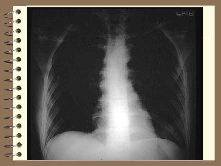 Рентгенограмма сердца. На снимке сердце имеет вид косо расположенного овала с верхушкой, обращенной к грудине. Восходящая и нисходящая аорта наслаиваются друг на друга. Справа определяется часть левого легкого, затем тень сердца, далее позадисердечное пространство, образованное обоими легкими и средостением, потом позвоночник и часть правого легкого.