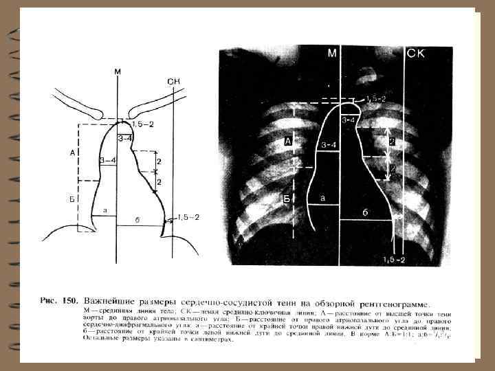Аортальная конфигурация сердца 1. Границы сердца увеличены влево и (часто) вниз за счет увеличения левого желудочка. 2. Размеры сердца: длинник > 15 см; поперечник > 13 см за счет увеличения ms; косой размер нормальный: 9 -11 см. Такая конфигурация сердца характерна для аортальных пороков сердца, артериальной гипертонии